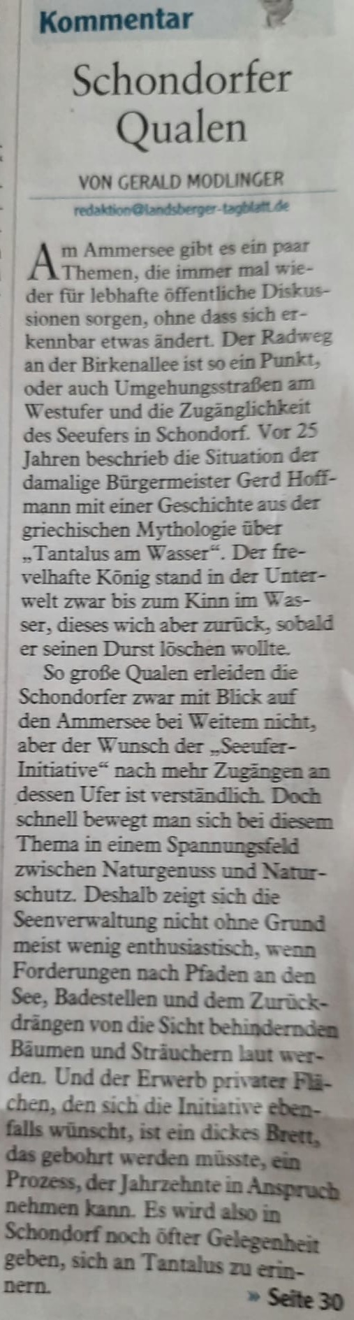 Schondorf sollte langfristig denken und sich den öffentlichen Raum am Seeufer sichern. Es geht um die Gestaltung des Ufers in den nächsten Jahrzehnten. Anstehende Erbschaften erhöhen den Druck auf das Seeufer. Öffentliche Zugänge, „Gestrüpp“ und Bäume im Seeblick gelten als wertmindernd. Schleichend wird das Seeufer freigeräumt und baulich wie gärtnerisch kultiviert. Eine konsequente Aufteilung des Ufers in Schutz-Zonen und Bereiche, in denen der Mensch konzentriert Zugang zum See hat, wäre besser. Sowohl für die Natur als auch für Schondorf mit seinen über 4.000 Einwohnern. Schondorf hat diese Möglichkeiten. Sie sind nur nicht bekannt.