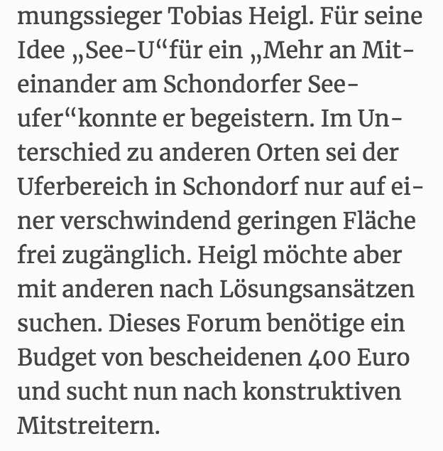 Was die Gruppe um Tobias Heigl wurmt: Bürgermeister Alexander Herrmann sieht die Annahme von See-U im Bürgerbudget-Wettbewerb im Nachhinein als Fehler an. Denn laut den Statuten dürften nur Projekte in die Auswahl kommen, die innerhalb eines Jahres realisiert werden können. Und bei See-U würde das, wenn überhaupt und dann nur teilweise, eine unendliche Geschichte werden.