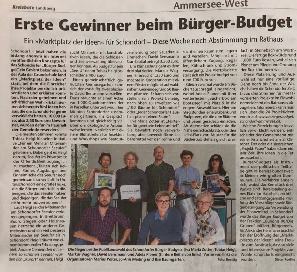 Schondorf – Tobias Heigl ging mit seiner „See-U Initiative“ beim letztjährigen Bürgerbudget der Gemeinde Schondorf mit 101 Stimmen als klarer Sieger hervor. Während die nächst platzierten Projekte „Kühlschrank für gerettete Lebensmittel“ (43 Stimmen) und „Gemüsegarten“ (42 Stimmen) längst realisiert wurden, geht es bei See-U und ihrem Ideenpaket nur langsam voran.